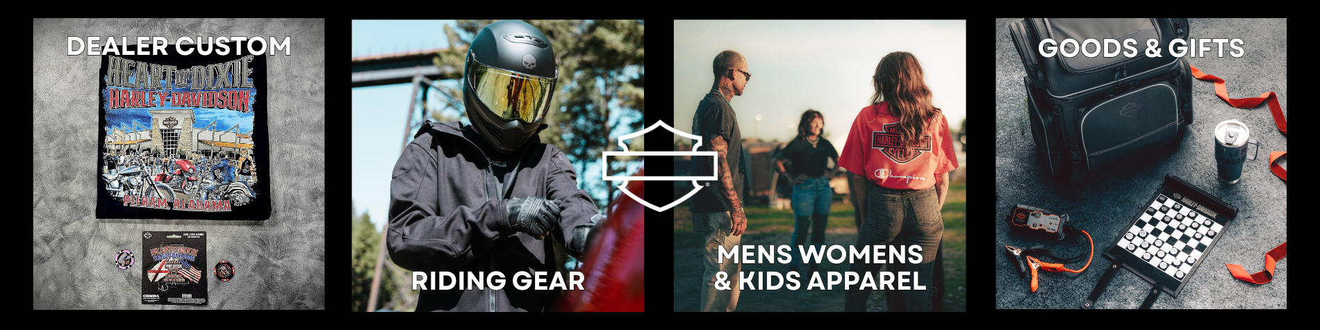 Come in and meet our MotorClothes® merchandise associates. They can assist you when searching for the items you crave. We offer a wide variety of Genuine Harley-Davidson® MotorClothes® merchandise for men, women, and children. Harley-Davidson® MotorClothes® merchandise is designed especially for guys and gals who love to ride. We also offer a huge selection of MotorClothes® Collectibles. Dealer personalized T-shirts are also available with our Heart of Dixie Harley-Davidson® logo. Jewelry, pet accessories, and raingear are just some of the many products we have to offer. We are located just south of Pelham Al 35124, so stop by and see what we have waiting for you.